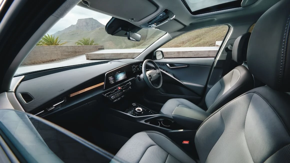 The fresh and expressive sculpted body shape and exceptional crossover looks of the Niro are designed to delight in what the future holds. Besides the distinctive two-tone hexagonal front grille, the unique EV-only exterior design also features a wide body coloured bumper design, in-corporating a central charging point. Plus Steel Gray body cladding and a Steel Gray Aero-Third Roof Pillar are available for yet more character.